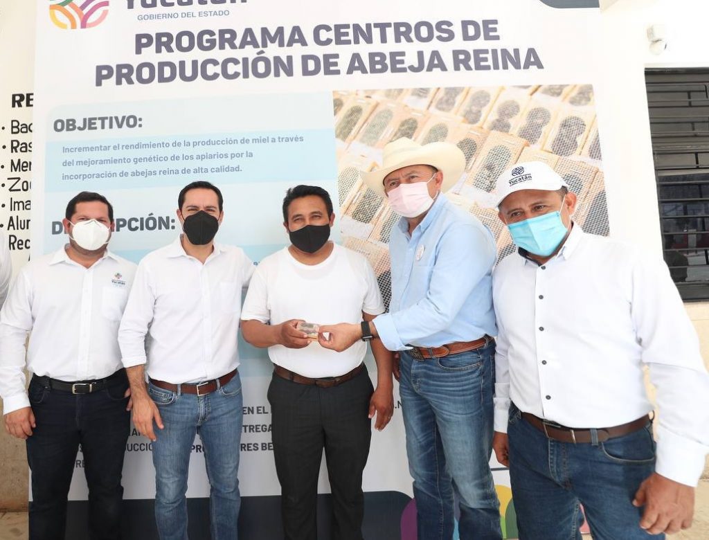 De igual forma, el Gobernador hizo entrega de paquetes de abeja reina del programa Centro de Producción de Abeja Reina, con el cual se está beneficiando a 86 apicultores de Tizimín con la entrega total de 1,250 obreras. A la fecha, se han entregado cerca de 14,000 de estos insectos en variedades como las Golden, Italiana y Carniola que mejoran la calidad y aumentan la producción hasta un 30% más por colmena de la miel yucateca.