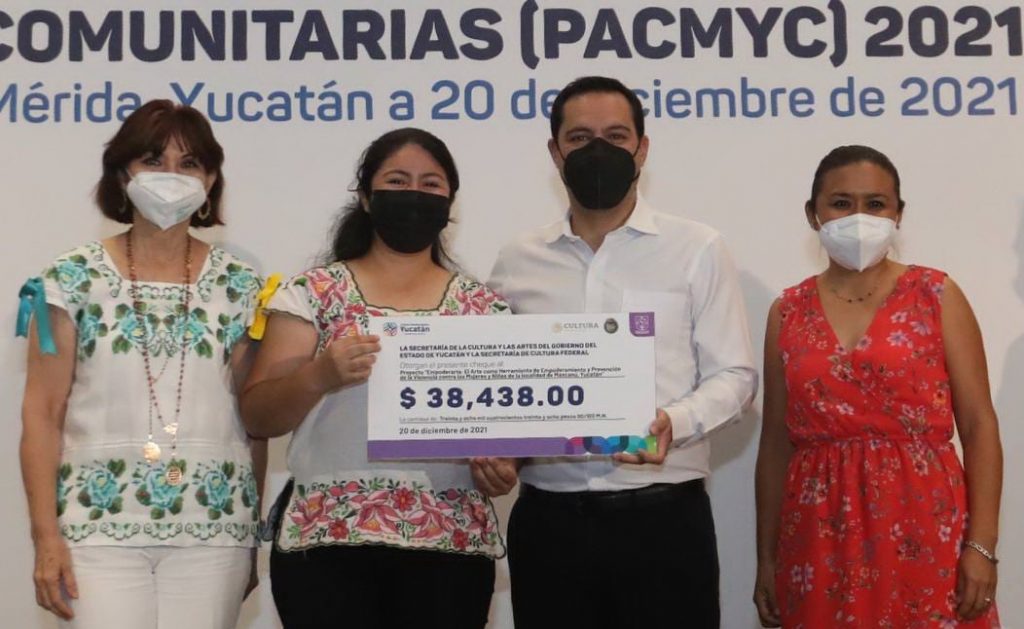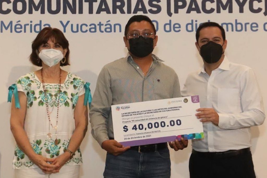 Entre los proyectos que recibieron estímulos este día, se encuentra “Mi comunidad sin violencia de género”, también de Maxcanú, el cual se incluye en Artes Escénicas y Visuales, y recibió la cantidad de 40 mil pesos para el montaje y representación de una obra de teatro.
