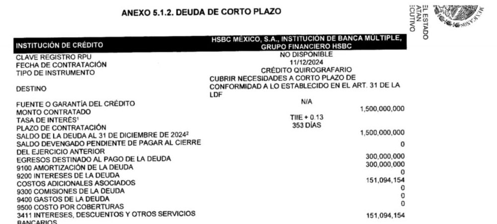 Con esta decisión, al adeudo de 7 mil 445 millones se le suman 1,600 millones en obras para modernizar el Puerto de Altura y, adicionalmente, se suma un préstamo a corto plazo por 1,500 millones de pesos, que no fue comunicado previamente, pero que fue contratado el 11 de diciembre.