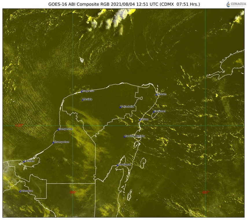 04/08/2021. –Península de Yucatán: Cielo medio nublado en la mañana y nublado por la tarde con chubascos y descargas eléctricas en Campeche, además de lluvias aisladas en Yucatán y Quintana Roo. Ambiente templado a cálido por la mañana y caluroso por la tarde. Viento del este y sureste de 10 a 25 km/h con rachas de 50 a 60 km/h en costas de Campeche y Yucatán.