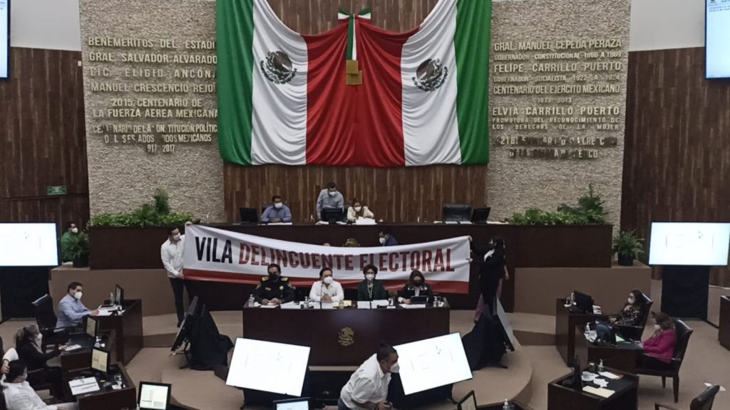 Sin embargo, cuando se realizaba esta, los cuatro legisladores de Morena, tomaron la tribuna, y expusieron una lona con la leyenda “Vila Delincuente Electoral”.