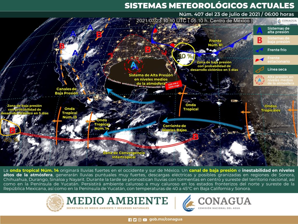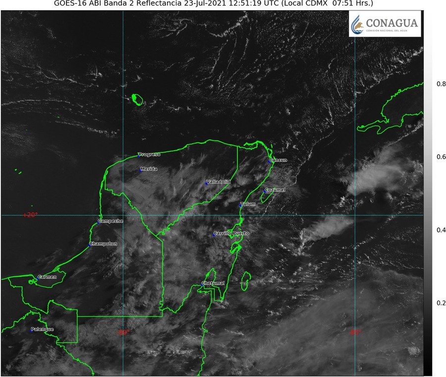 23/07/2021. Península de Yucatán: Cielo medio nublado por la tarde con chubascos aislados y descargas eléctricas en la región. Ambiente fresco por la mañana y muy caluroso por la tarde. Viento del este y noreste de 20 a 35 km/h con rachas de hasta 50 km/h en costas de Campeche y Yucatán.
