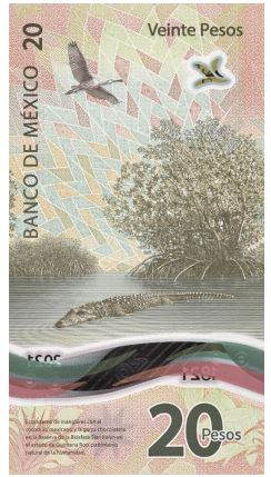 Reverso: Se ilustra el ecosistema de manglares en la Reserva de la Biósfera Sian Ka’an, en el estado de Quintana Roo, patrimonio natural de la humanidad. Al centro de la composición, como motivo principal, está la imagen de un cocodrilo mexicano, y como fondo, el mangle rojo y una garza chocolatera en vuelo; abajo se encuentra la ventana transparente que atraviesa el billete horizontalmente y tiene tonalidades verdes y rojas.