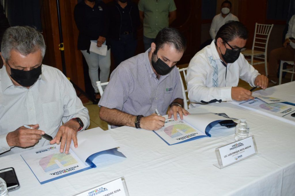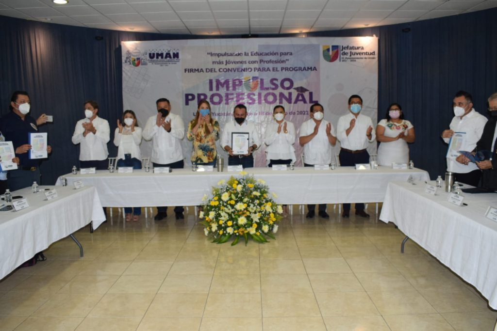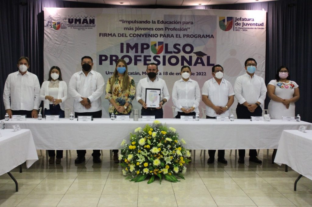 YUCATÁN, 18/01/2022. —Mediante la firma del “Pacto Universitario” en el que participan 20 escuelas que ofertan becas, todos los umanenses que deseen superarse podrán hacerlo, ya que este acuerdo permitirá que puedan culminar sus estudios de nivel medio superior y superior, así como participar en las Expo Universidades, entre otros beneficios.
