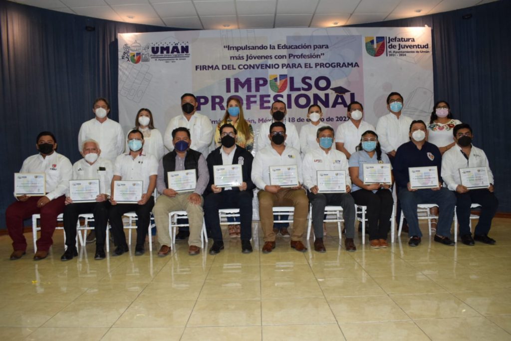 YUCATÁN, 18/01/2022. —Mediante la firma del “Pacto Universitario” en el que participan 20 escuelas que ofertan becas, todos los umanenses que deseen superarse podrán hacerlo, ya que este acuerdo permitirá que puedan culminar sus estudios de nivel medio superior y superior, así como participar en las Expo Universidades, entre otros beneficios.
