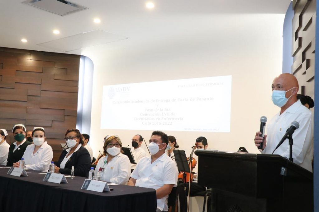 Mérida, 23/06/2022.- Por medio de la tradicional y emotiva Ceremonia del Paso de la Luz, un total de 30 estudiantes pertenecientes a la LVII generación de la Licenciatura en Enfermería de la Universidad Autónoma de Yucatán (UADY), recibieron sus cartas de pasantes.