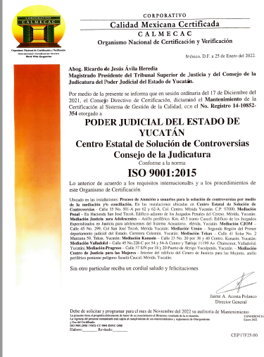 Mérida,11/02/2022. -Luego de haber aprobado la auditoría externa para el mantenimiento de certificación de la norma ISO 9001:2015 en 2021, el Centro Estatal de Solución de Controversias (CESC) del Poder Judicial del Estado de Yucatán, recibió este día, el documento que la acredita.
