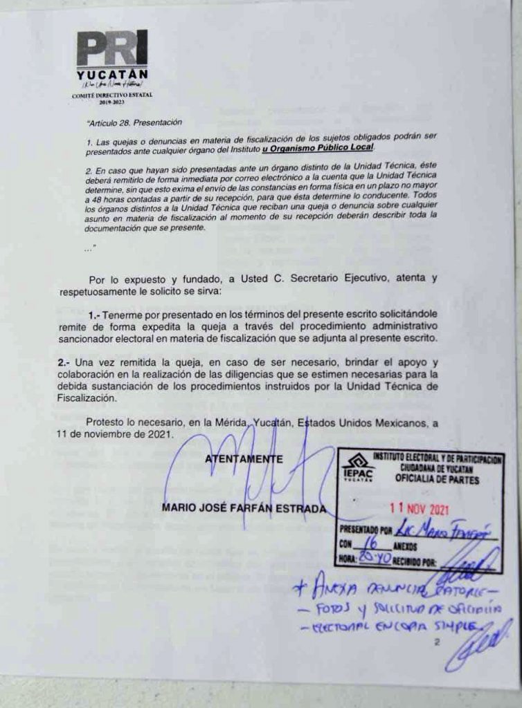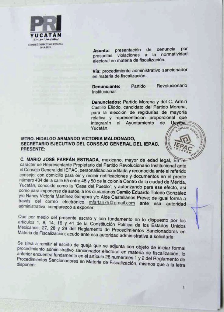 “Panchito” explicó que con pruebas acudieron a realizar la denuncia ante Instituto Electoral y de Participación Ciudadana Yucatán, ya que el partido de Morena y su candidato Armin Castillo Eliodo, por lo siguiente:
