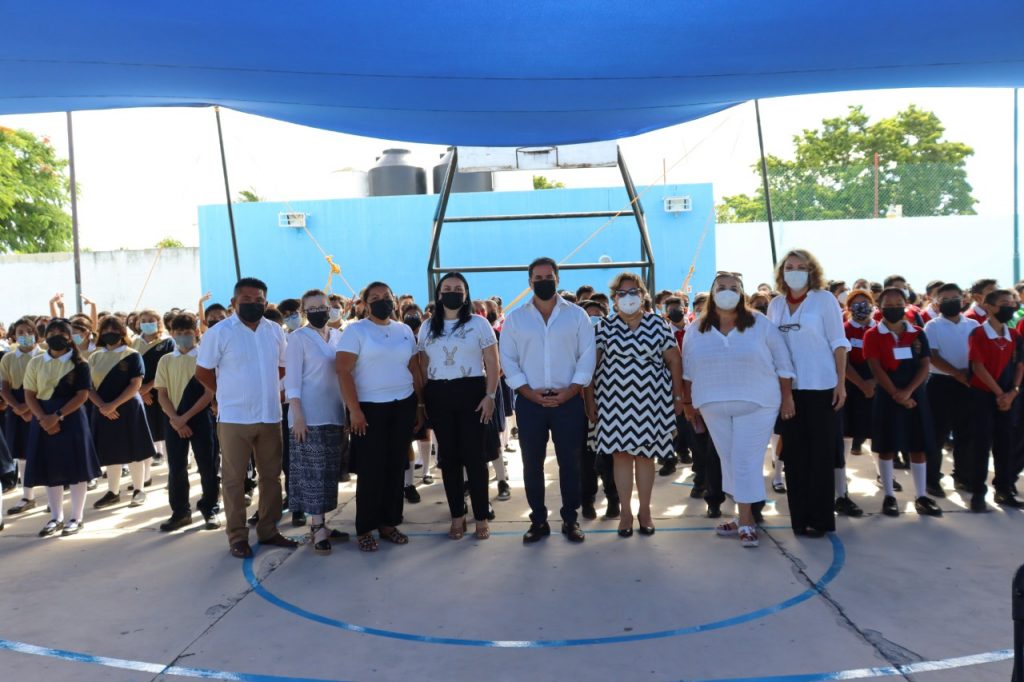 YUCATÁN, 02/09/2022. – El alcalde Julián Zacarías Curi, encabezó el banderazo de inicio del ciclo escolar 2022 – 2023, en las instalaciones de la secundaria “Rafael Cházaro Pérez”, plantel en donde también se llevó al cabo la entrega de señalética vial.