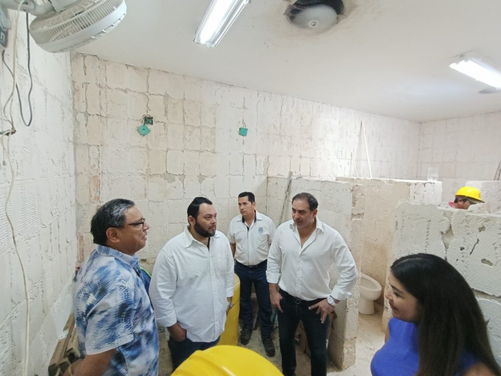 Durante la supervisión, le acompañaron el director de Obras Públicas, Luis Castro Naal, la titular de Emprendimiento, Fomento Económico y Mercado, Karenina Sánchez y el supervisor de la obra de la empresa “Rosendo Ceballos”, el arquitecto Jorge Ku, quienes explicaron los recientes trabajos que constan de desmantelamiento y retiro de lozas en paredes y pisos de los baños, así como el cambio de nueve inodoros, tanto para damas como caballeros, en éste se incluirá un mingitorio prefabricado en lámina de acero inoxidable.