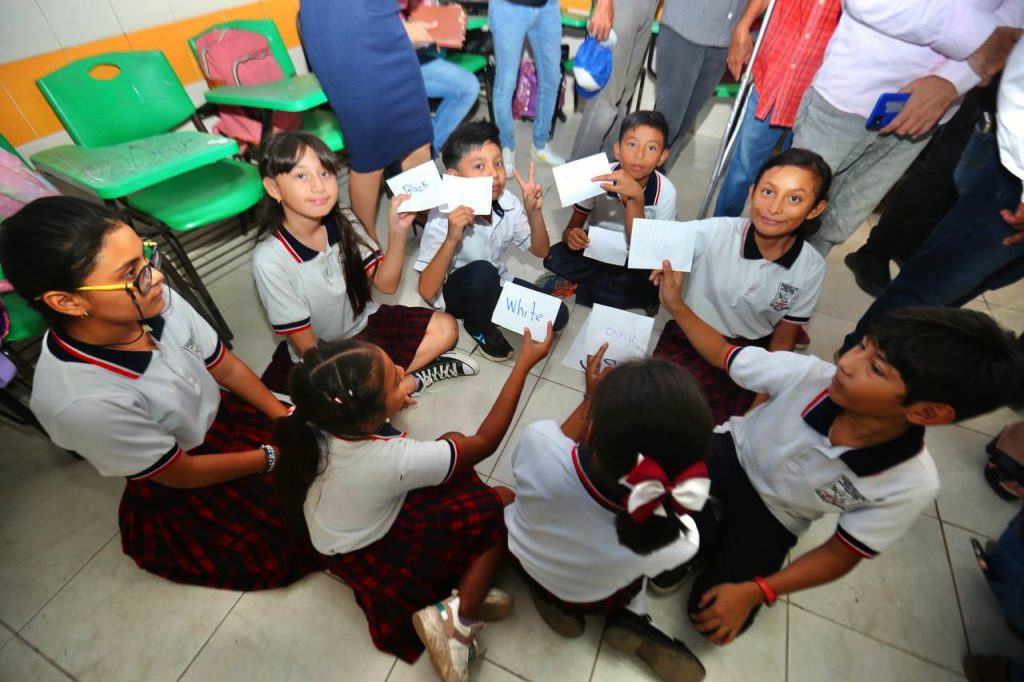 En presencia del secretario de Educación, Liborio Vidal Aguilar, y con la guía del maestro René Zapata Arjona, los estudiantes trabajaron grupos de palabras como: animales, frutas, colores y útiles escolares; demostrando su habilidad para reconocer comandos, instrucciones en inglés y dando una muestra de su pronunciación.