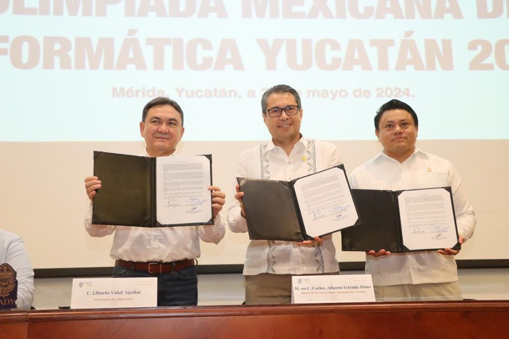 MÉRIDA, YUCATÁN, 25/05/2024. —Para promover el estudio de la computación de forma creativa, buscando desarrollar el razonamiento y la imaginación de las niñas, niños y jóvenes, la Secretaría de Educación del Gobierno del Estado de Yucatán (Segey) y la Universidad Autónoma de Yucatán (UADY) firmaron una Carta Intención de Colaboración para la realización de la Olimpiada Mexicana de Informática en Yucatán.