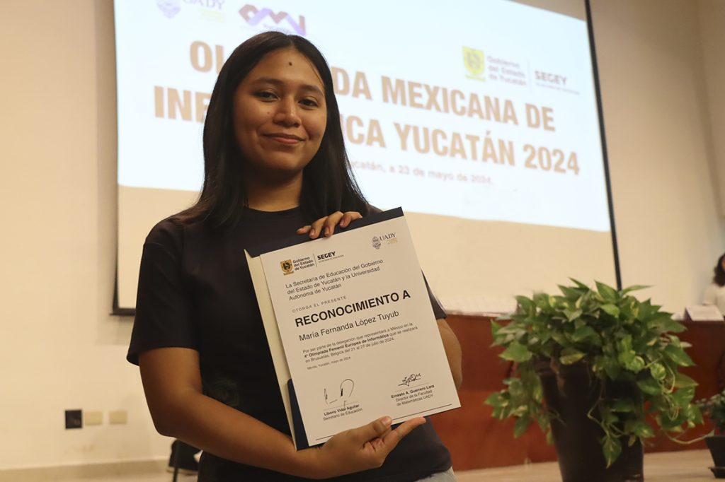 En este sentido, felicito a María Fernanda López Tuyub, estudiante de la Preparatoria 2 de la UADY, por ser parte de la delegación que representará a México en la cuarta Olimpiada Femenil Europea de Informática, que se realizará en Bruselas, Bélgica del 21 al 27 de julio de 2024.