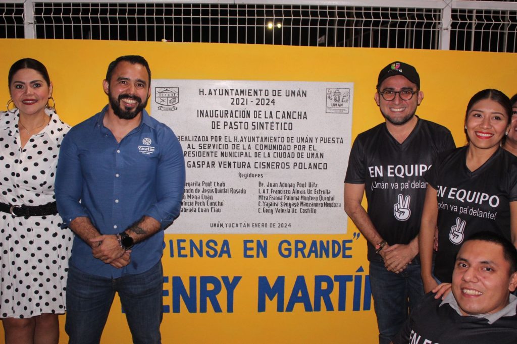 UMÁN, YUCATÁN, 04/01/2024. —Inauguran la cancha de futbol 7, de pasto sintético que lleva por nombre “Henry Martín” en el municipio de Umán, un sueño cumplido a los deportistas que anhelaban un espacio digno y con instalaciones de primer nivel para poder hacer deporte.