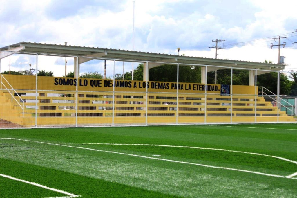 El proyecto consistió en la construcción de la cancha de pasto sintético con una dimensión de 1,749.00 M2, instalación de 12 luminarias, instalación de reja de acero, edificación de gradas con techado y porterías.