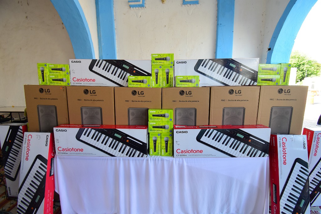 En esta ocasión los ayuntamientos recibieron micrófonos, bocinas amplificadas e instrumentos musicales que se suman al mobiliario, pantallas y guitarras que se les proporcionó el año pasado.