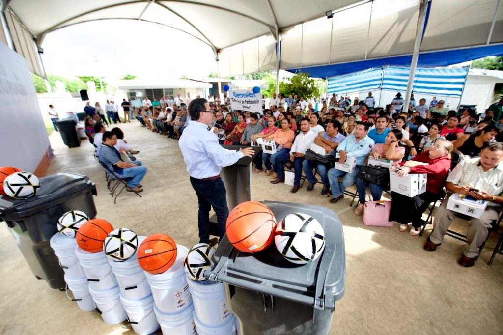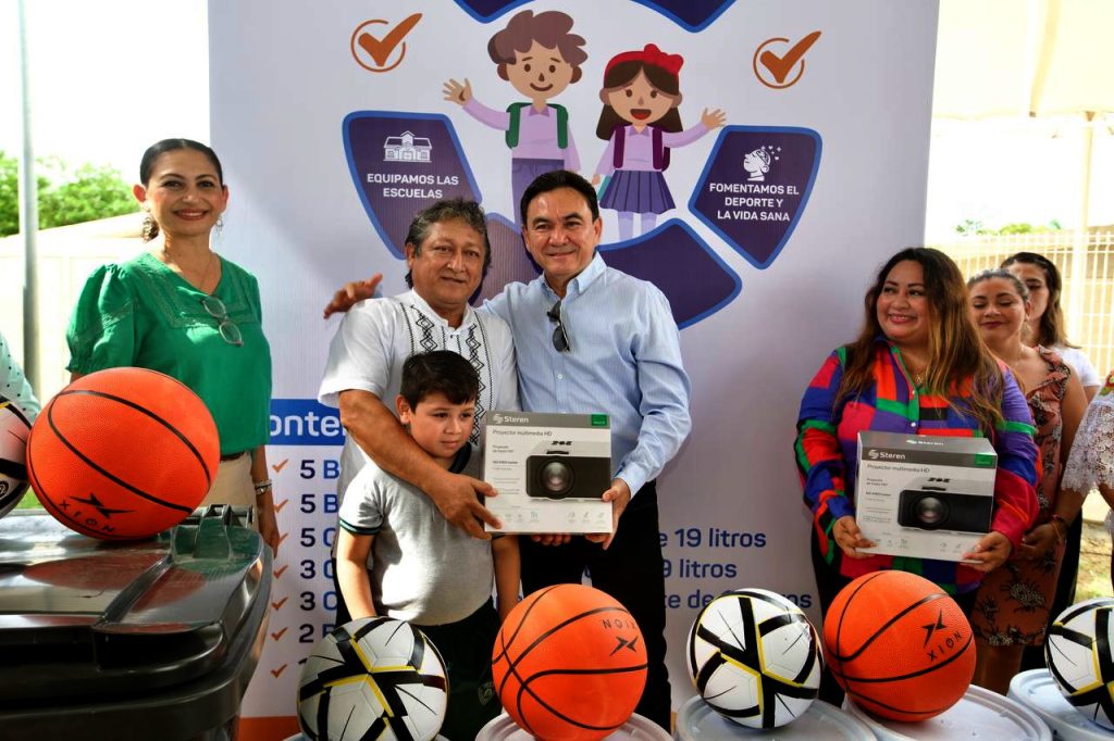 MÉRIDA, YUCATÁN, 28/11/2023. —Para equipar, modernizar, mejorar la enseñanza y fomentar el deporte y la vida sana en alumnas y alumnos, la Secretaría de Educación del Gobierno del Estado de Yucatán (SEGEY), hizo entrega de 22 paquetes “Mejora tu Primaria” a 18 planteles del complejo habitacional Caucel.