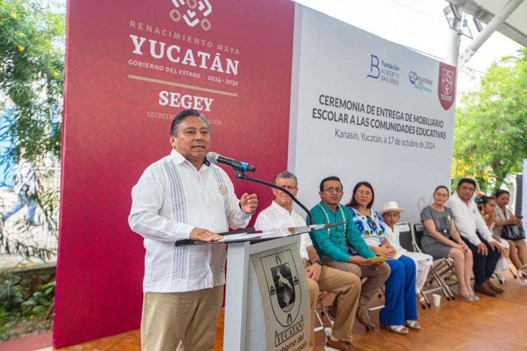 KANASÍN, YUCATÁN, 19/10/2024. —Con el objetivo de propiciar espacios educativos en donde niñas, niños y jóvenes del municipio de Kanasín reciban una educación integral y de calidad, el Secretario de Educación del Gobierno del Estado de Yucatán (SEGEY), Juan Enrique Balam Várguez, entregó mobiliario escolar.