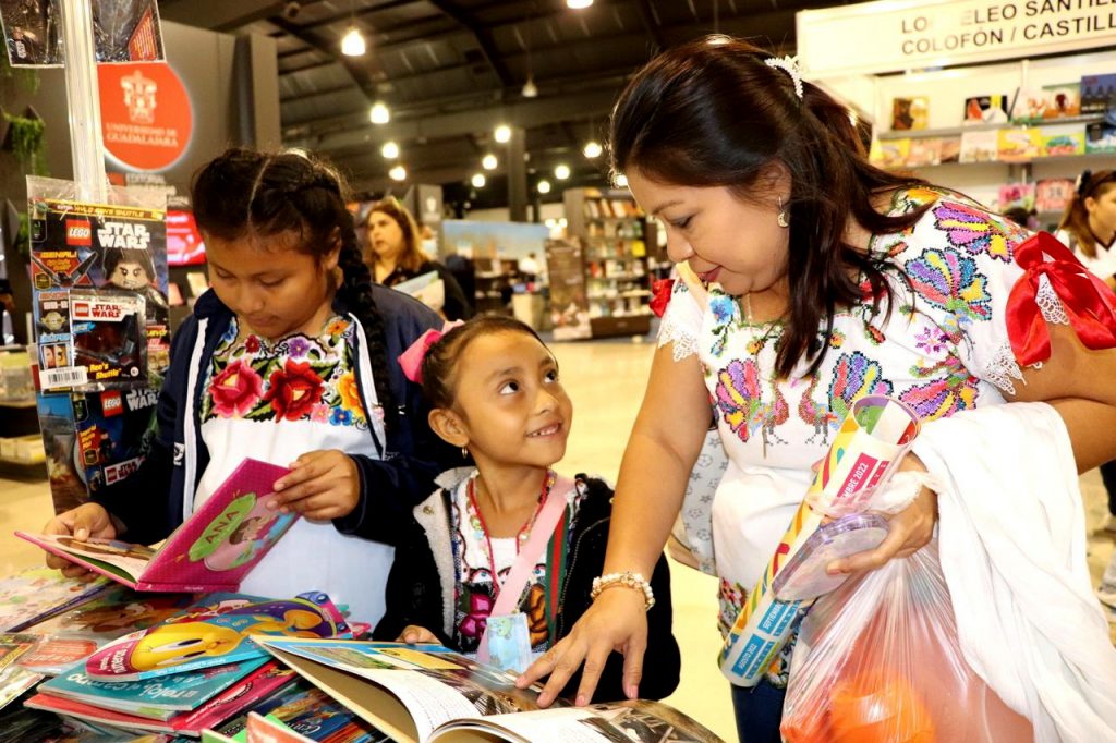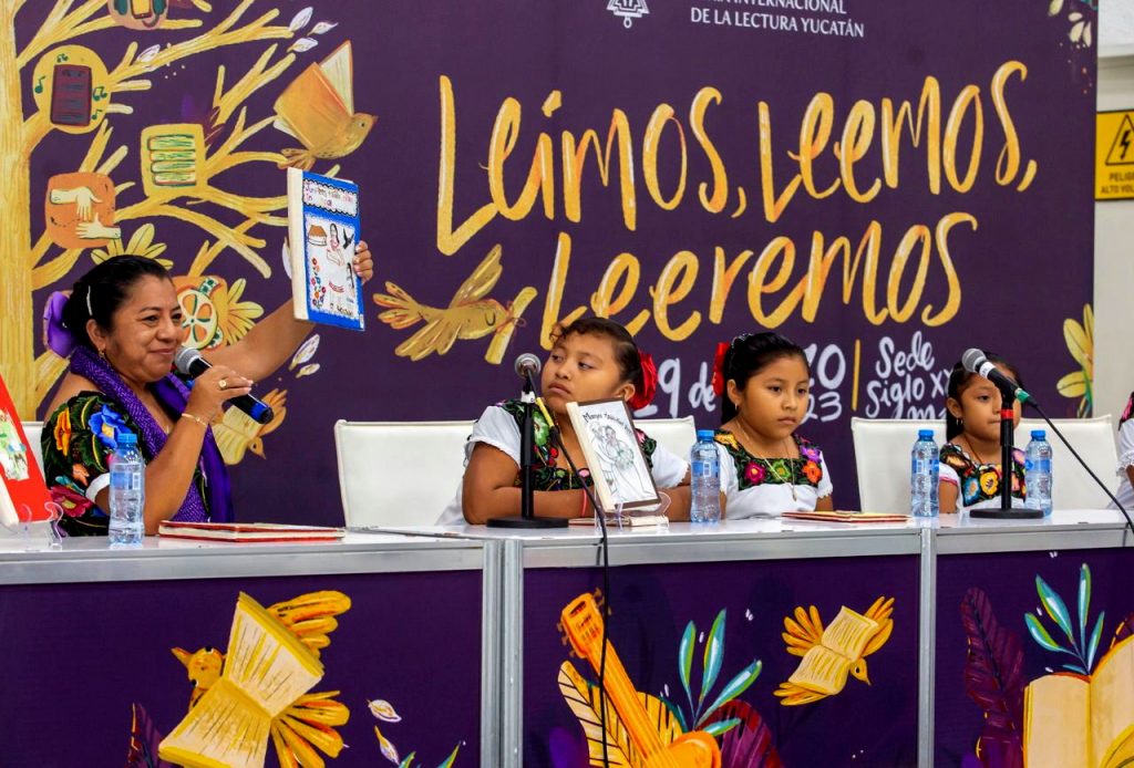 MÉRIDA, YUCATÁN 18/03/2023. —Estudiantes y docentes de la escuela primaria indígena “Benito Juárez” de la comisaría de Hunukú, Temozón cautivaron a los asistentes de la Feria Internacional de la Lectura Yucatán (FILEY) 2023, en la presentación de los libros cartoneros, una expresión de la cultura maya, los cuales compilan los saberes, historias y narran episodios de la vida cotidiana de la comunidad educativa y de la localidad.