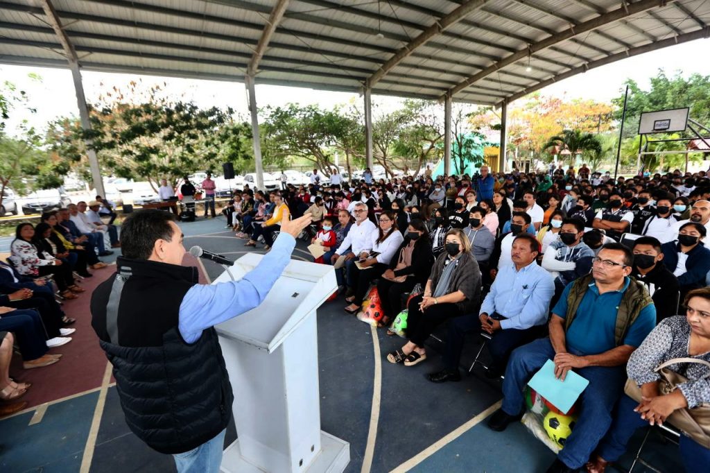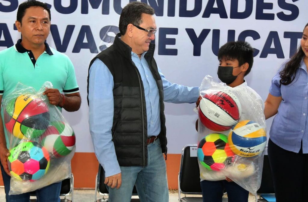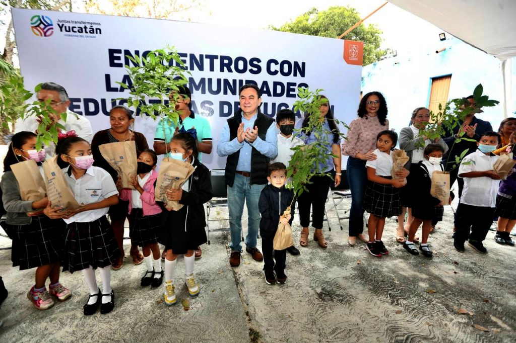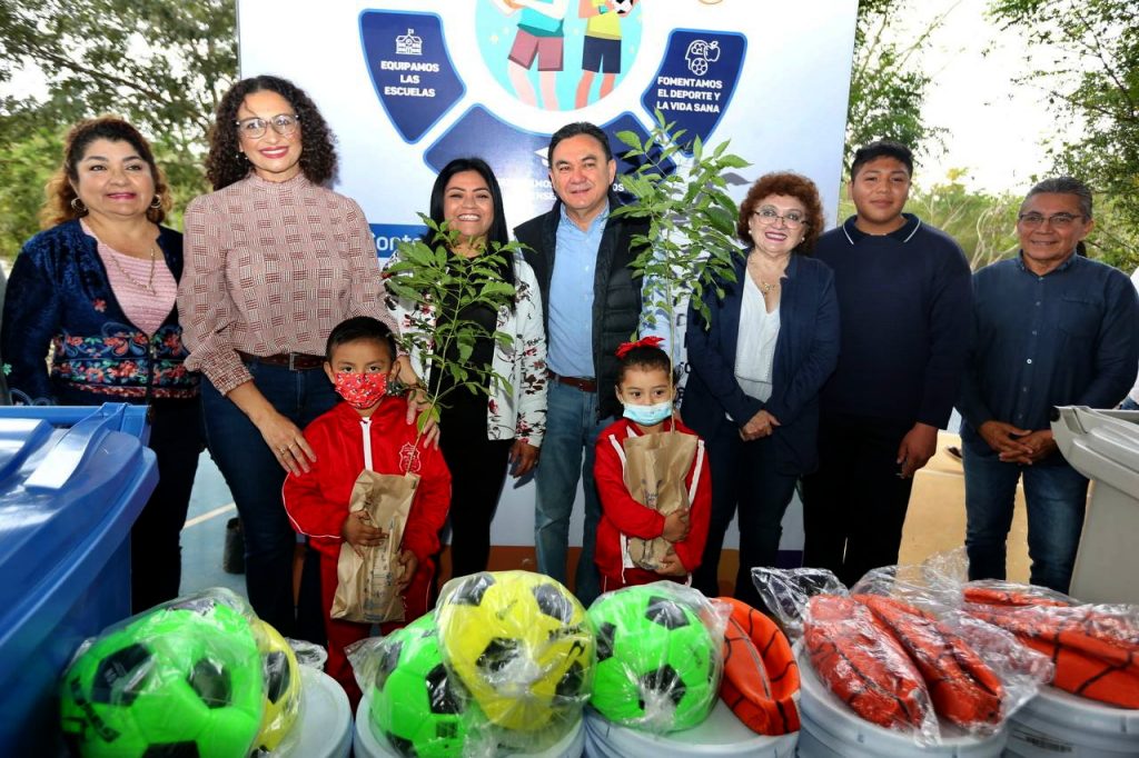 En gira de trabajo, el funcionario entregó paquetes “Mejora tu Secu”, material deportivo y plantas de la estrategia estatal de arborización, “Un niño, un árbol”, la cual se promueve en centros educativos de Mérida y el interior del estado.
