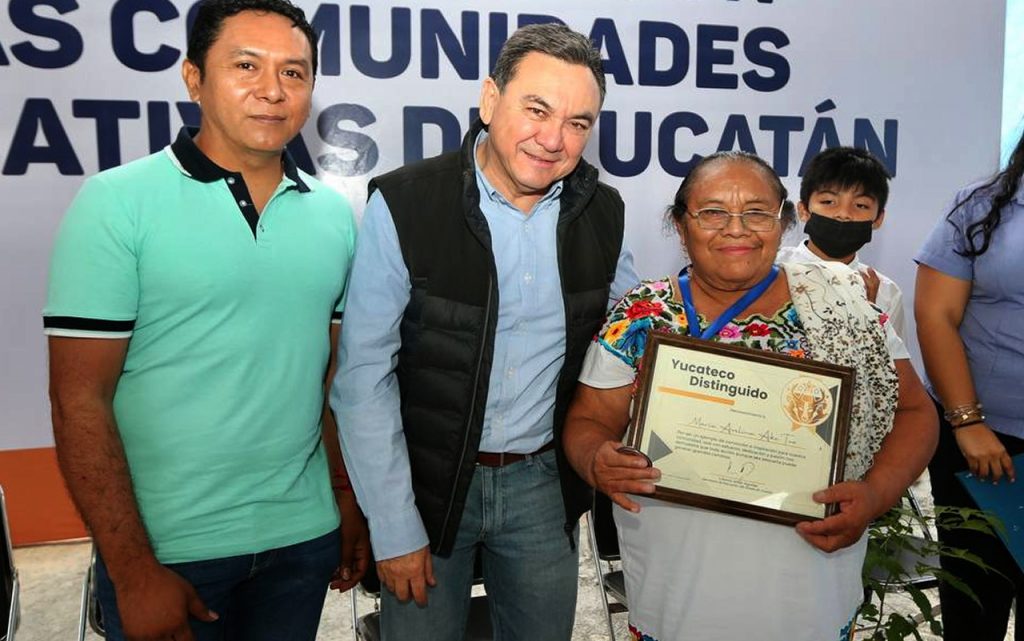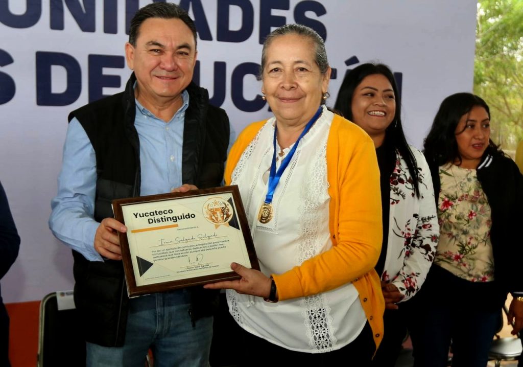 En el marco de esta gira se entregó la medalla “Yucateco Distinguido” al maestro de Educación Física Alejandro Gutiérrez Monjiote, a la docente Irma Salgado Salgado, ambos de Komchén y la integrante de la sociedad de padres de familia, María Avelina Aké Tuz, de Cosgaya.