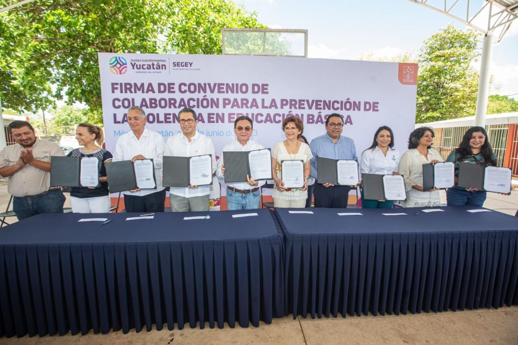 MÉRIDA, YUCATÁN, 14/06/2023. —Con el objetivo de promover una vida digna y seguridad en niñas, niños y adolescentes que estudian en escuelas de educación básica, la Secretaría de Educación firmó un convenio de colaboración con diversas instancias gubernamentales y organizaciones de la sociedad civil para promover acciones en conjunto que atiendan los casos de violencia en primarias y secundarias.