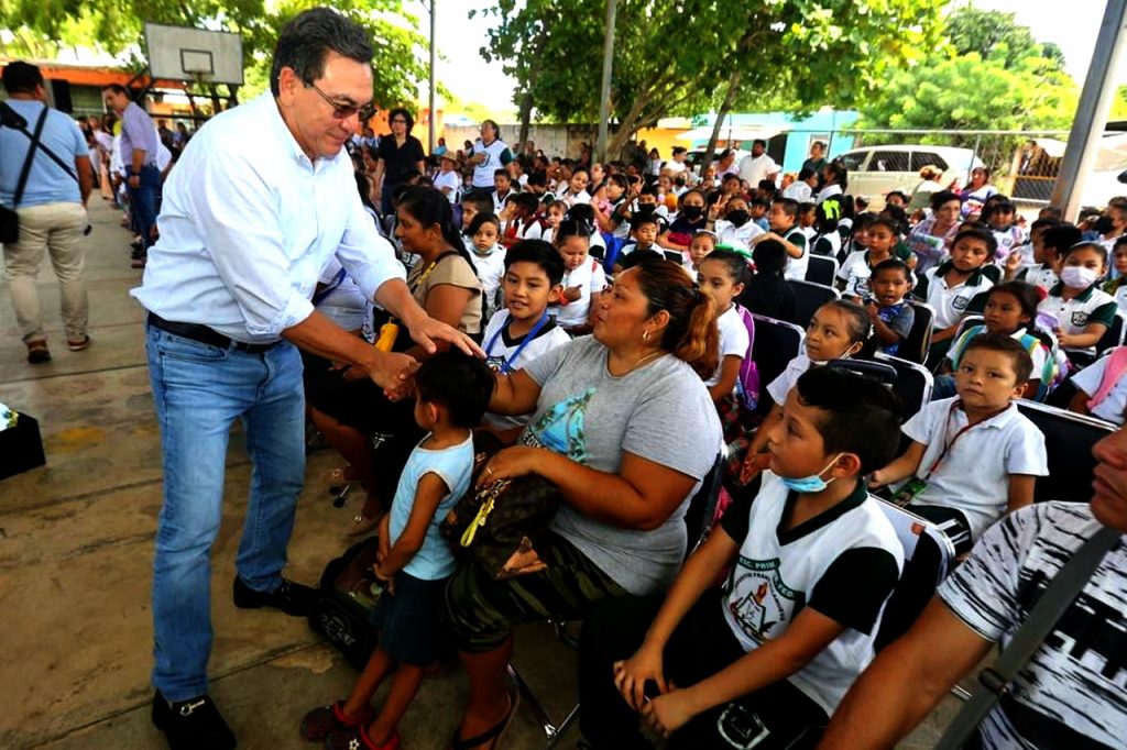 En gira de trabajo por la escuela primaria Agustín Franco Villanueva, ubicada en el sur de Mérida, el secretario de Educación, Liborio Vidal Aguilar, encabezó la entrega de 675 paquetes escolares, así como 60 sillas con paleta, en beneficio de alumnas y alumnos de ambos turnos.