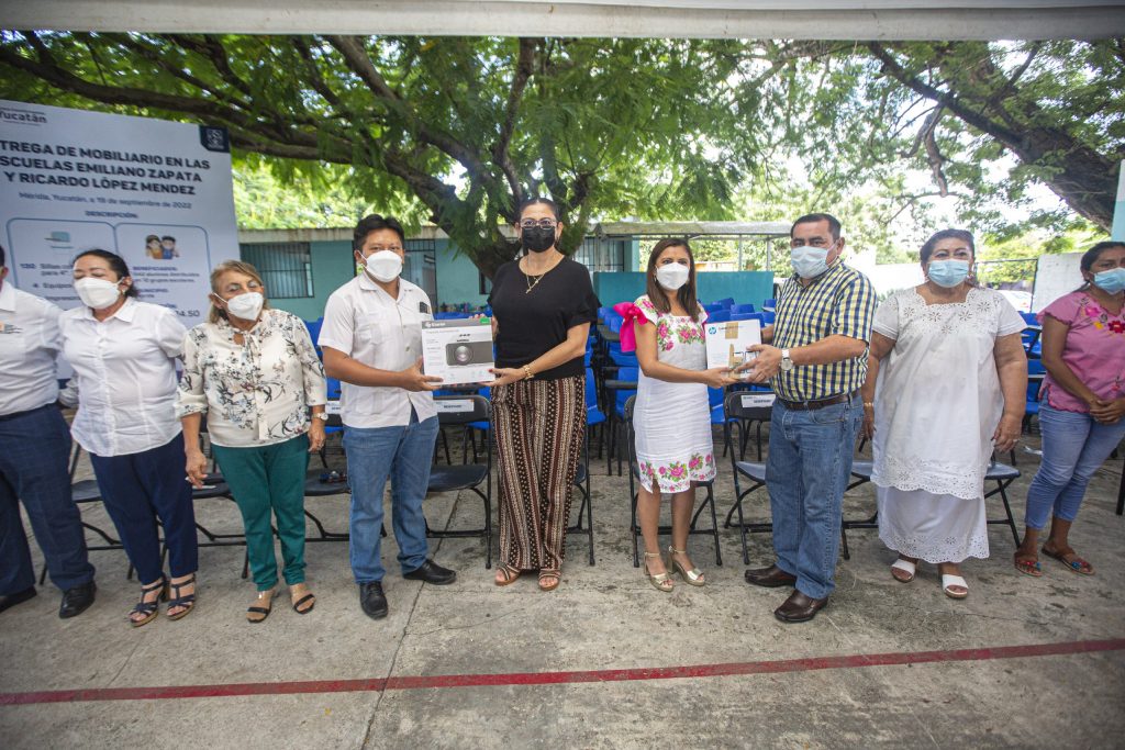 Los centros educativos que recibieron el mobiliario y equipo son: “Emiliano Zapata” y “Ricardo López Méndez” así como “Ana María de los Ángeles Piña Azcorra” y “Adolfo Cisneros Cámara”, que fueron visitadas hace unos días por Vila Dosal y en atención a las necesidades expresadas por la comunidad escolar, se les dio respuesta inmediata.