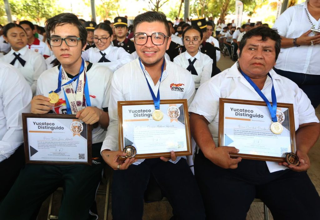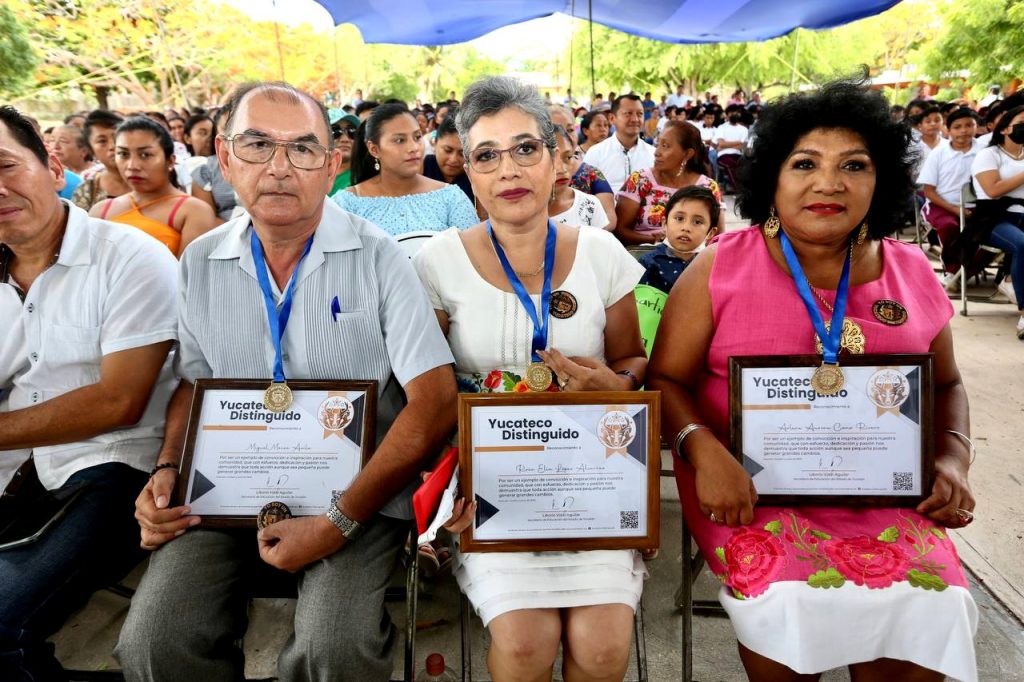 En ambas escuelas secundarias se otorgaron los reconocimientos de Yucateco Distinguido a docentes, deportistas y maestros que han sobresalido en su área con gran esfuerzo y dedicación. En Acanceh, los homenajeados fueron Marlene Cano Rivero, Rosa López Alcarraz y Miguel Maiza Ávila; en la escuela “22 de febrero”, Rocío Pineda Moguel, Guillermo Gaspar Medina Uicab, Jesús Flores Díaz y el líder de la CROC, Pedro Oxté Conrado.