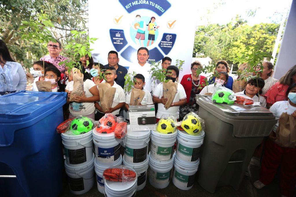 Cuatro secundarias, una de cada localidad, recibieron un kit de la estrategia “Mejora tu Secu” que contiene 1 proyector multimedia, 2 contenedores de basura, 5 cubetas de pintura blanca de 19 litros, 3 cubetas de pintura azul de 19 litros, 3 cubetas de impermeabilizante de 19 litros, así como 5 balones de futbol y 5 de basquetbol. Está iniciativa apoyará a 463 secundarias de la entidad durante este ciclo escolar.