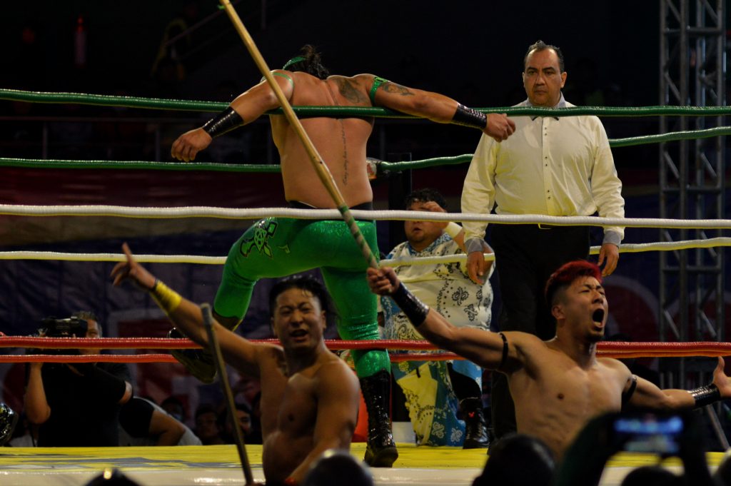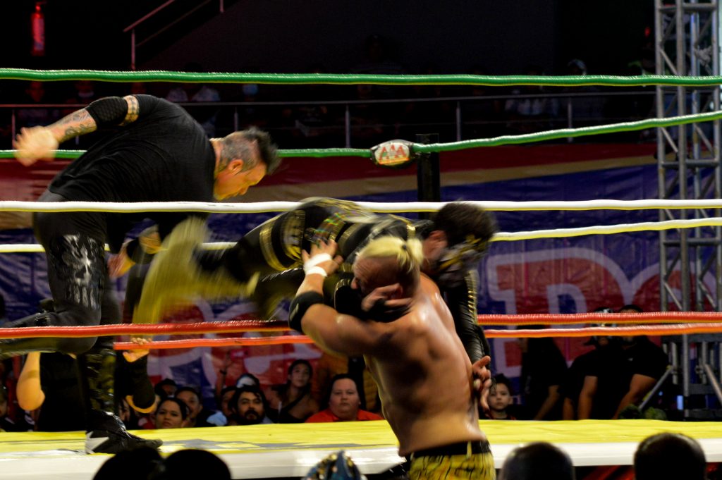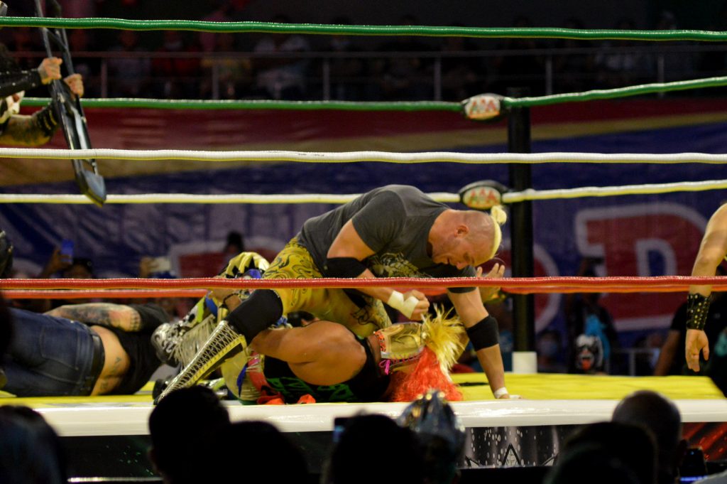 Luego aparecieron los estelares, los grupos que buscaban llegar a la pelea final para obtener la espada de “Rey de Reyes”; en la que triunfo el norteamericano San Adonis, pero con un golpe a los testículos a su unos de sus rivales, y que el refreír, “no lo vio”, y así levanto la mano al gabacho.