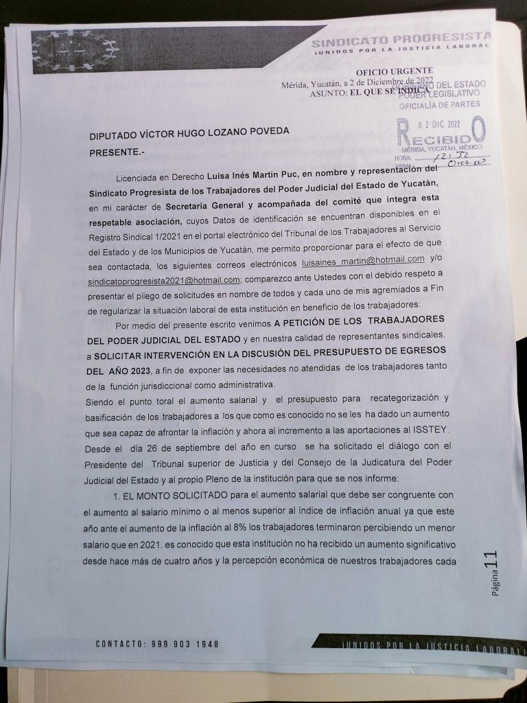 “El Sindicato Progresista presentó en el Congreso Yucatán sendos escritos para solicitar intervención mañana (por hoy) en la sesión de la Comisión de Presupuesto, donde se analizará el proyecto de presupuesto de egresos 2023 para el Poder Judicial, incluyendo el aumento del sueldo de todos los trabajadores del Poder Judicial de Yucatán (…) exigimos que se dignifique el salario a los trabajadores del Poder Judicial, y que se respeten nuestros derechos laborales”, dijo Luisa Inés.