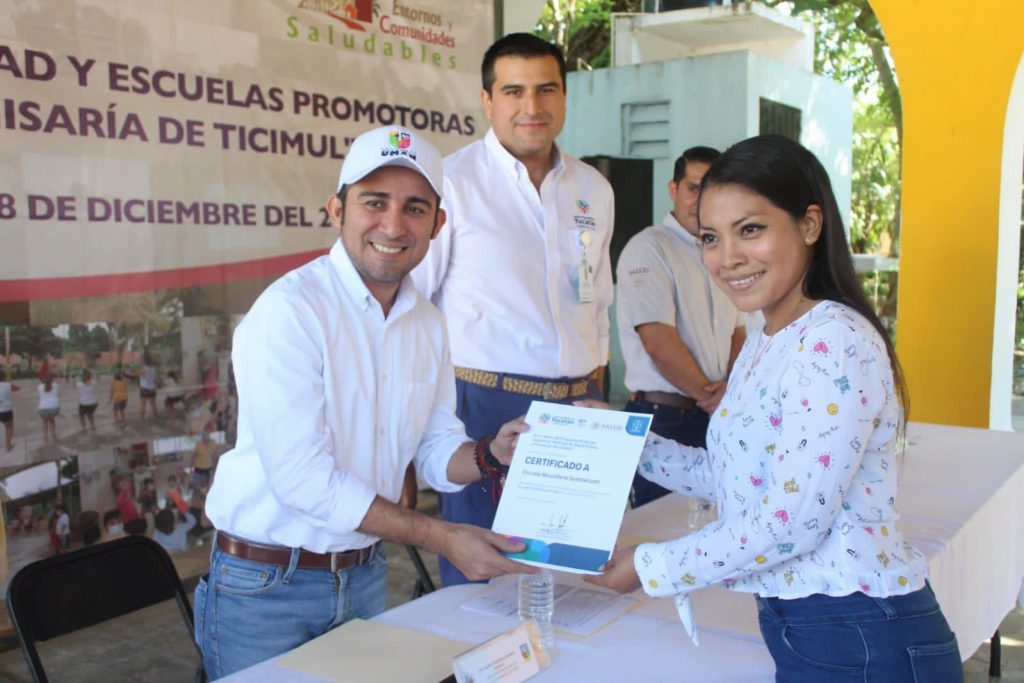 En el evento se reconoció a la ciudadana Elsi Guadalupe Celis Batun por tener la vivienda más limpia y se le entregó su Certificado de Escuelas Promotoras de la Salud al Preescolar “José María Iturralde Traconis” a la primaria “Primero de Mayo” y la secundaria Quetzalcóatl.