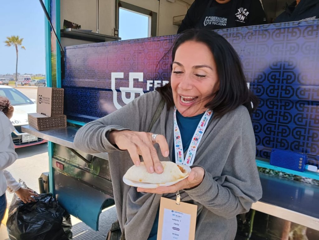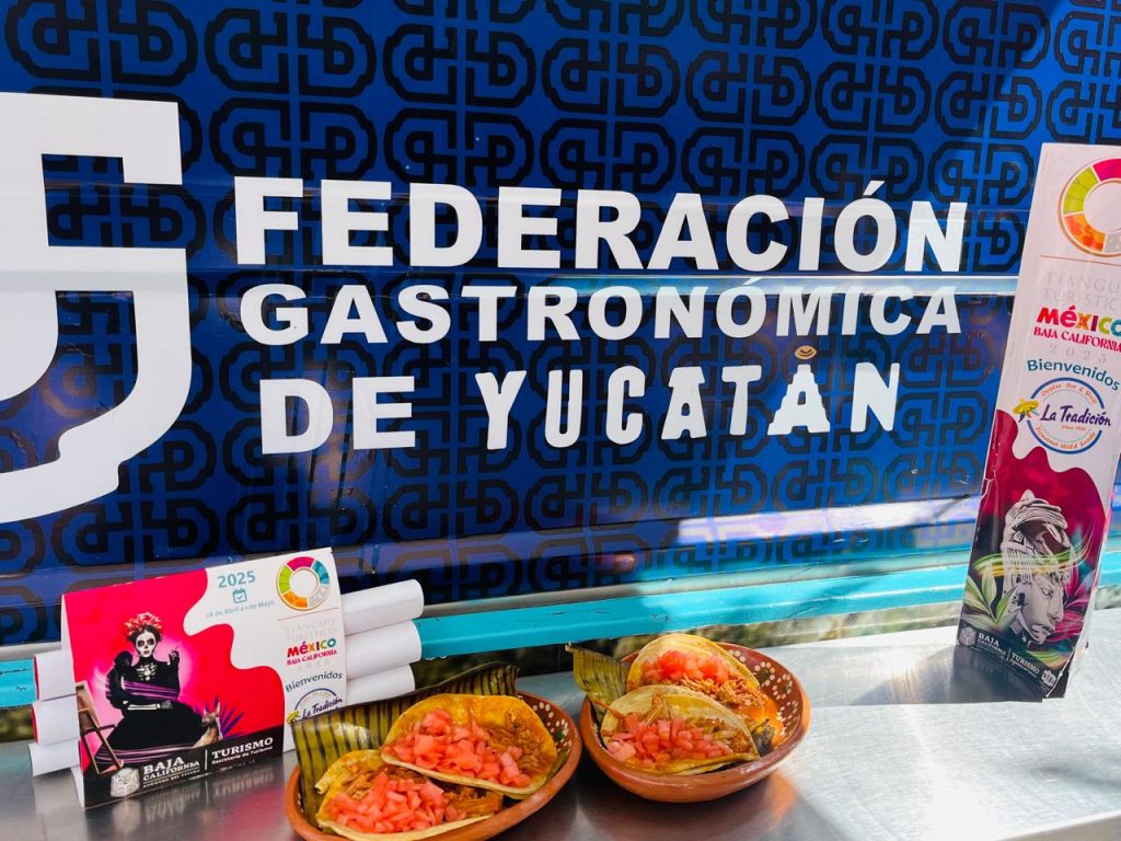TIJUANA, BAJA CALIFORNIA, 29/04/2025. —En su recorrido por Tijuana, el “Yucatruck” de la Federación Gastronómica de Yucatán llegó hasta el Baja California Center, lugar que alberga a miles de visitantes, nacionales y extranjeros, de la Edición 49 del Tianguis Turístico de México 2025, y donde continuó una gira de promoción exitosa, repartiendo miles de tacos de cochinita pibil en esa ciudad fronteriza.