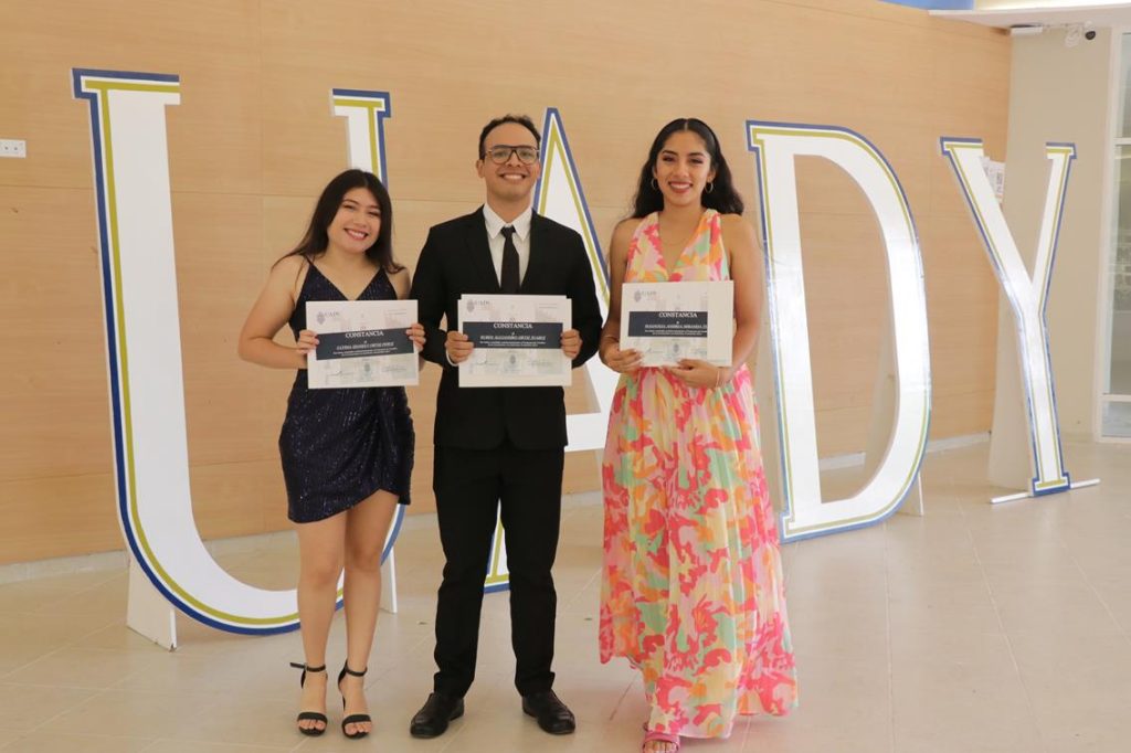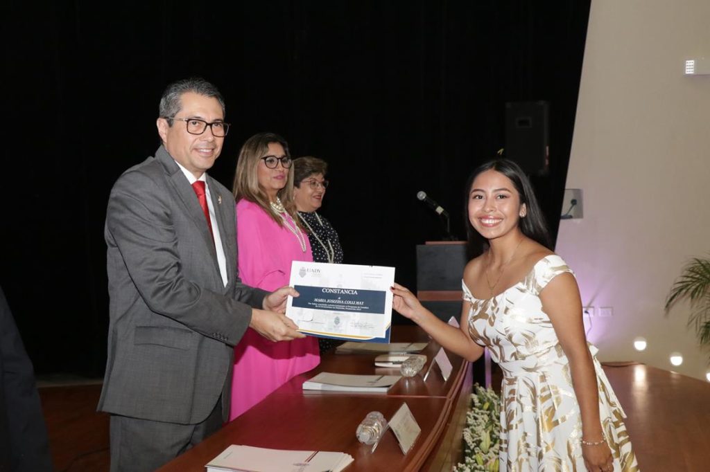 Al finalizar la entrega de constancias, se otorgó el reconocimiento de mejor promedio a: Melba Angélica Campo Franco y Ángela Natali Martín Valdez, de la Licenciatura en Nutrición generación XXIV y XXV, respectivamente; y para Cinthia Rosana Azcorra Puc, de la Licenciatura en Rehabilitación.