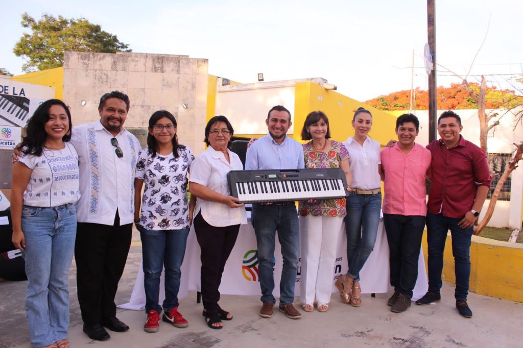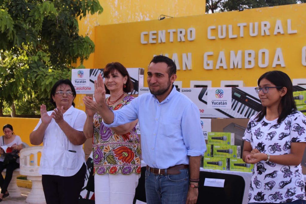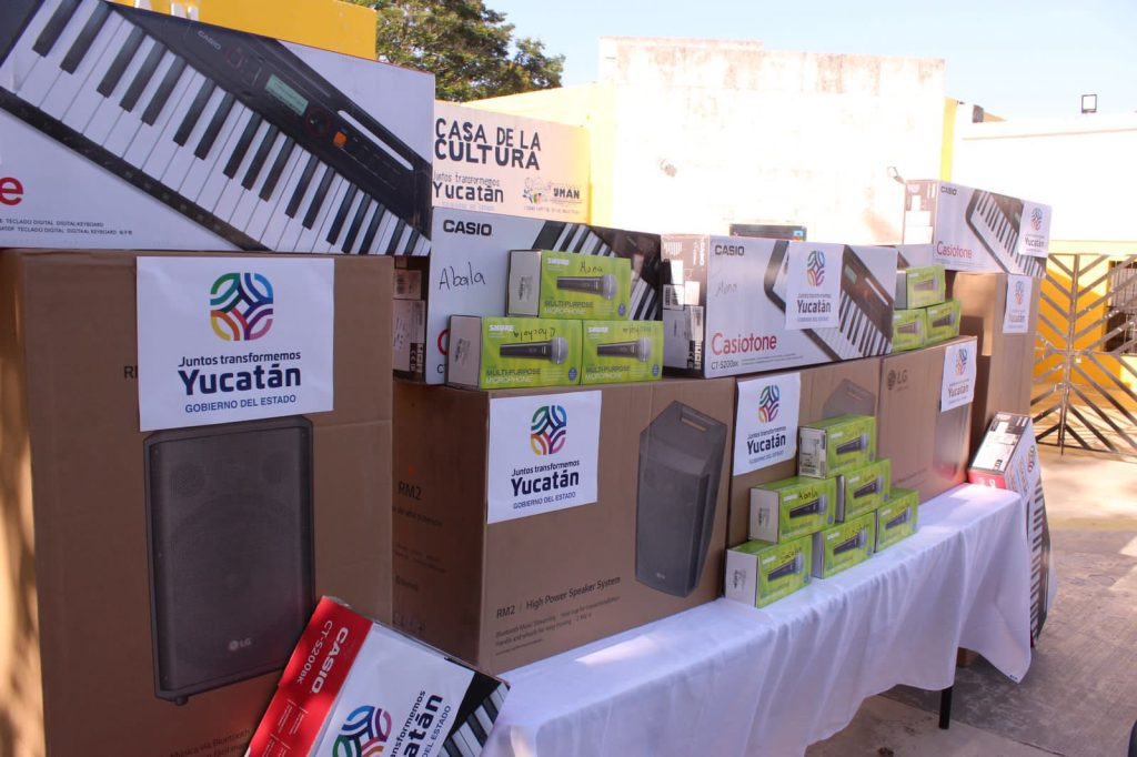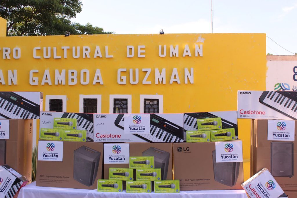 UMÁN, YUCATÁN, 29/07/2023. —Umán es sede de la entrega de equipamiento de siete Casas y Espacios de la Cultura en Yucatán que recibieron una bocina, dos micrófonos y un teclado que contribuirán a mejorar los talleres artísticos que se desarrollan en las localidades, brindar las herramientas dignas para promover el desarrollo cultural y creativo de la ciudad.