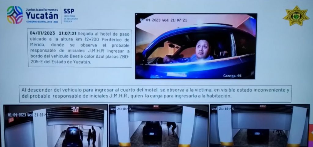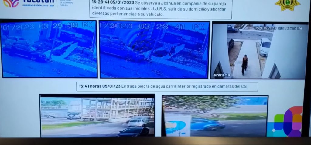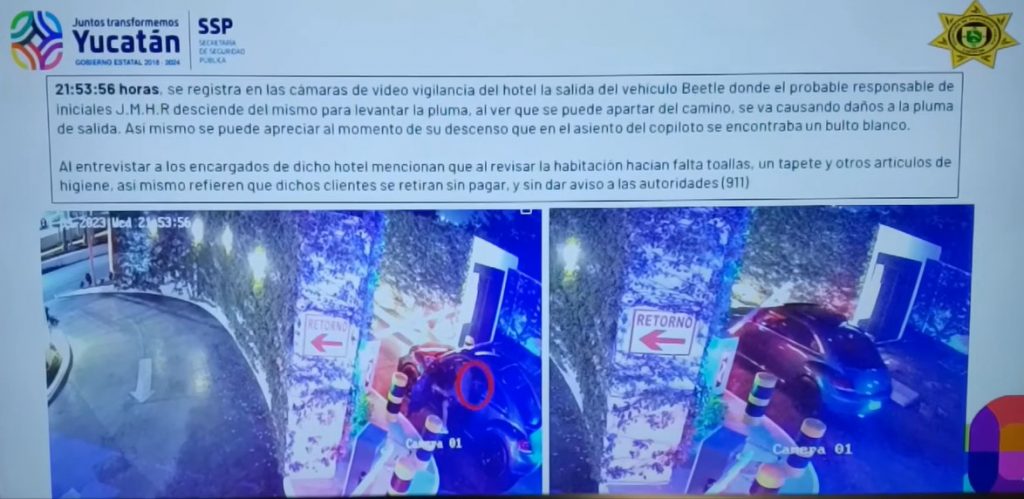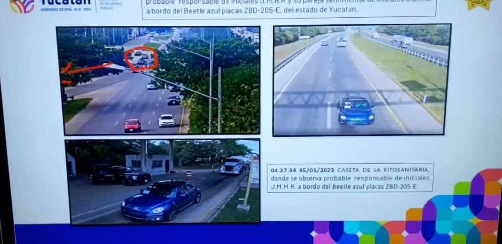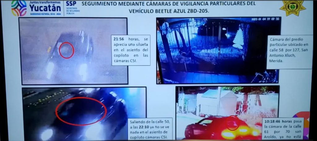El comisario, Carlos Eduardo Flores Moo, subsecretario de la Policía Estatal de Investigación, relató una línea del tiempo que fue establecida con los movimientos de la pareja que se desplazaba en un carro Beetle azul, con placas ZBD-205-E, esto mediante las videocámaras de vigilancia de la Policía estatal.