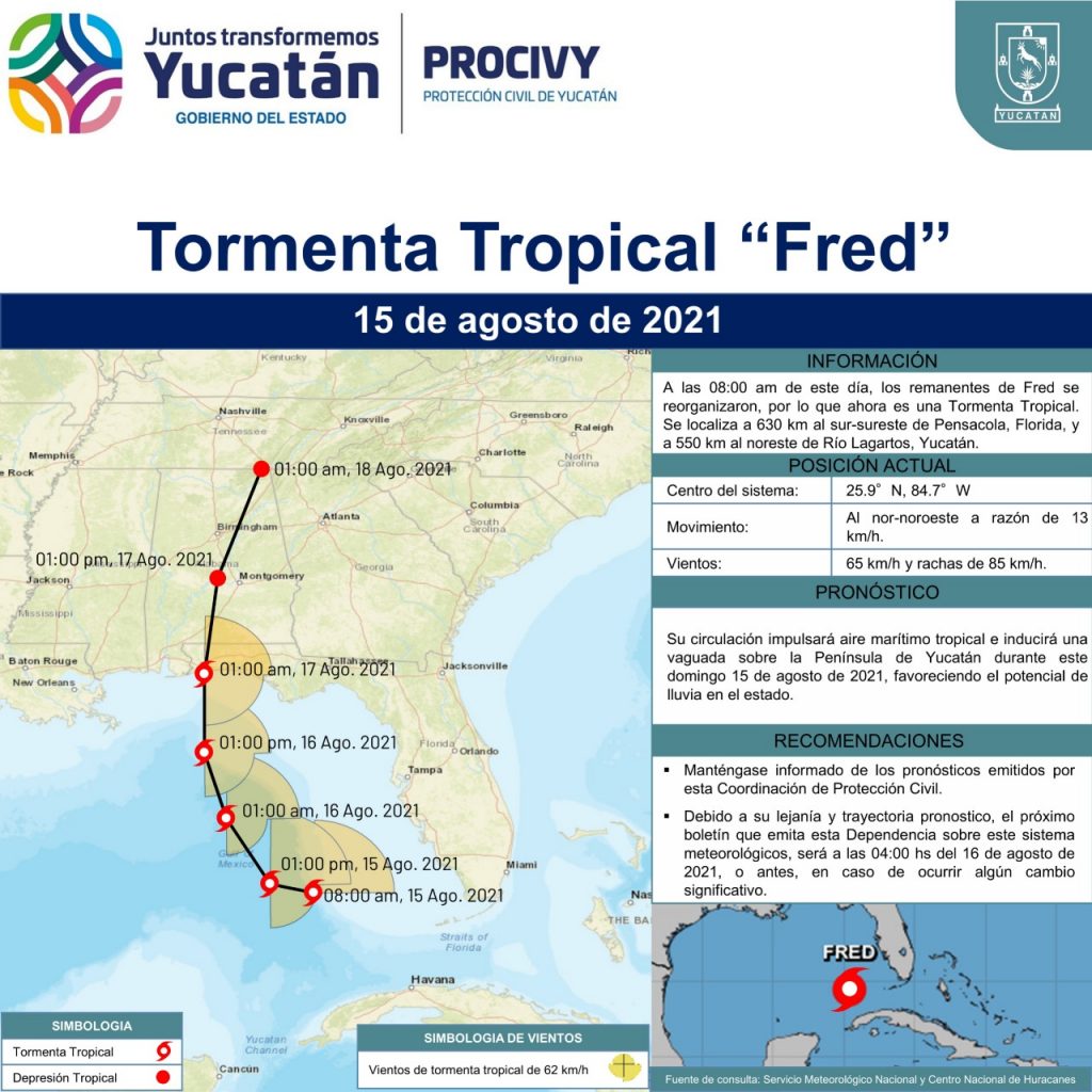 Se precisó que por las rutas y distancias en las que se encuentran dichos sistemas no representan riesgo directo para el estado. Detalló que una vaguada inducida por “Fred” favorecerá precipitaciones a partir de este domingo 15 de agosto, en todo el territorio estatal.